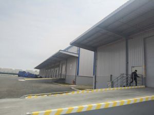 Cho thuê nhà kho khung thép Zamin mái lợp tôn, nền bê tông cánh cửa mở ra vào bằng thép