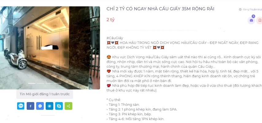 Ngại dịch bệnh đi lại, chị Hà đã lên mạng tìm hiểu các thông tin rao bán và gọi cho môi giới đăng tin để tìm hiểu cụ thể. Cảm thấy ưng một căn nhà 5 tầng, diện tích 35m2 rao bán giá 2 tỷ đồng ở Dịch Vọng (Cầu Giấy), chị Hà đã gọi cho môi giới để hỏi kỹ hơn. Khi ấy, chị lại được môi giới báo giá tăng thêm gần 1 tỷ đồng so với giá rao ở thông tin môi giới đăng. Mức giá đó vượt quá khả năng tài chính của hai vợ chồng nên chị Hà đã quyết định không đến xem trực tiếp.