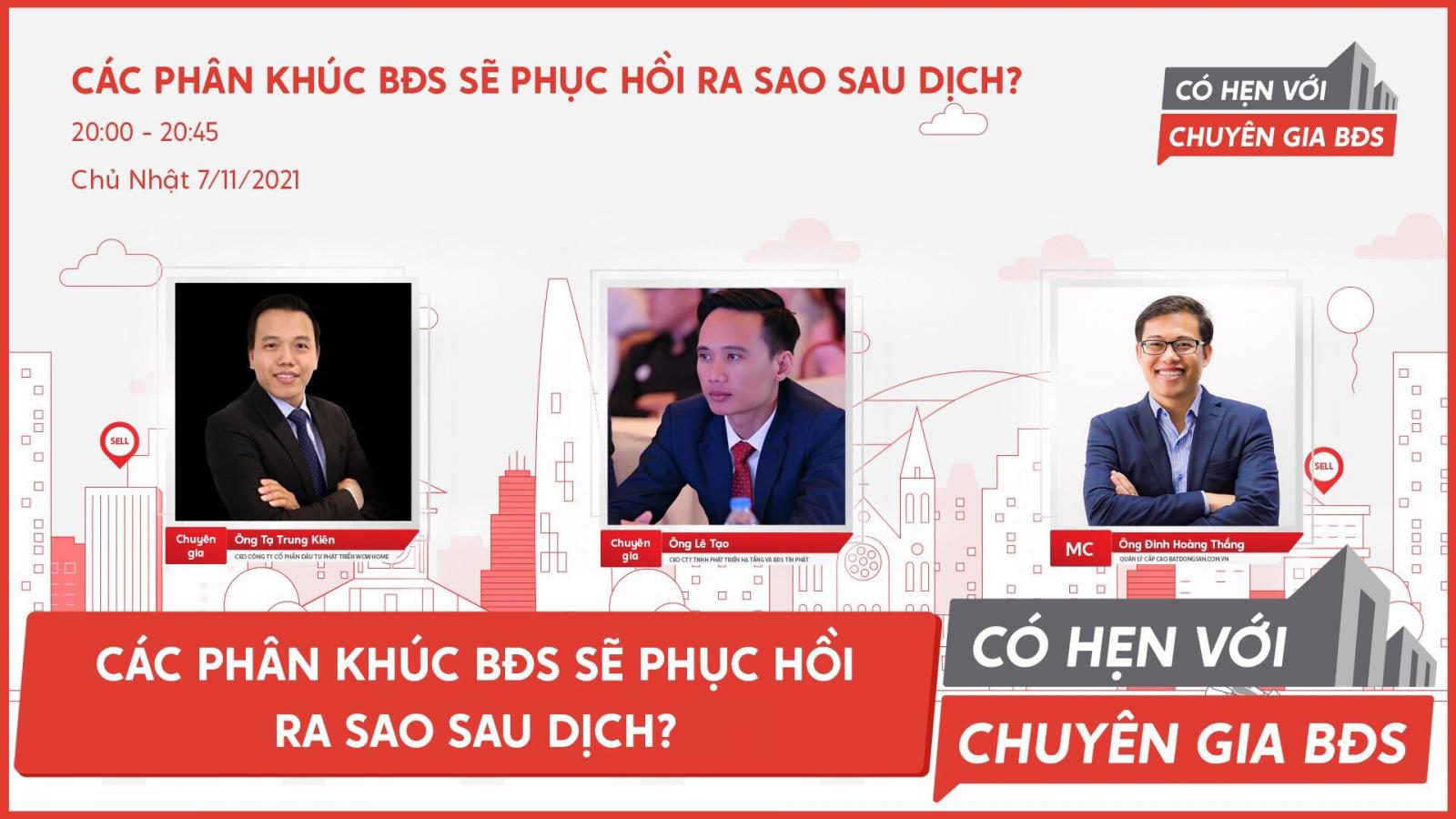 Tại chương trình “Có hẹn với chuyên gia BĐS” do Batdongsan.com.vn tổ chức mới đây, các chuyên gia khách mời cùng thảo luận về xu hướng hiện tại của thị trường và đưa ra những nhận định khách quan về khả năng phục hồi của từng loại hình BĐS sau đại dịch covid 19 lần 4.