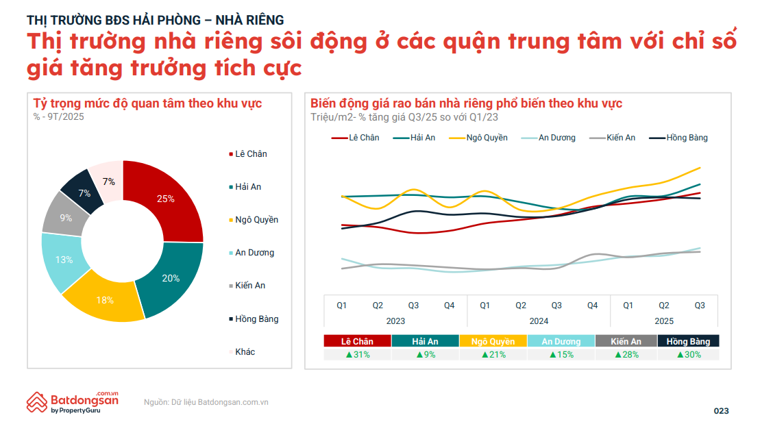 Nếu phân khúc chung cư thể hiện vai trò đầu tàu của thị trường Hải Phòng quý III/2025, thì nhà riêng và đất nền lại phản ánh rõ nét độ phân hóa giữa trung tâm và vùng ven khi giá tiếp tục tăng nhưng mức độ quan tâm chưa phục hồi mạnh.