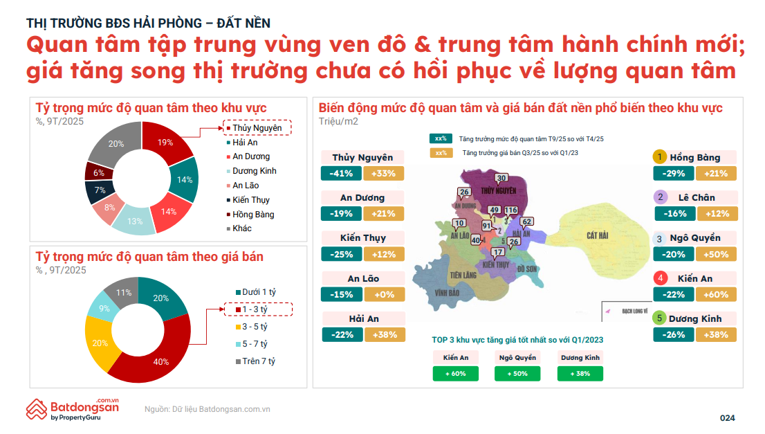 Cụ thể, Thủy Nguyên là khu vực chiếm 19% lượng tìm kiếm ghi nhận mức giảm quan tâm -41%, nhưng giá tăng +33%. An Dương giảm -19%, giá tăng +21%; Kiến Thụy -25%, +12%; Hải An -22%, +38%; Dương Kinh -26%, +38%; An Lão -15%, +15%.