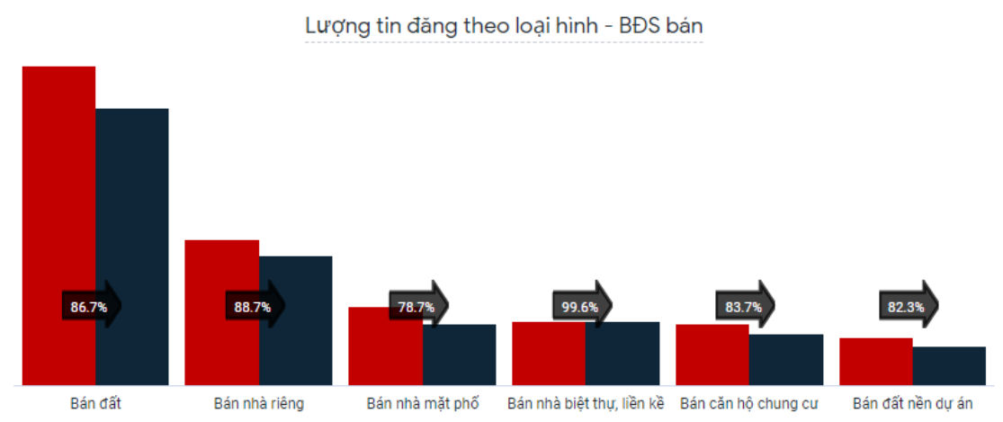 Cụ thể, chung cư ghi nhận lượng tin đăng sụt giảm mạnh nhất với 16% so với tháng 7, đất nền cũng giảm 13%. Lượt tìm kiếm đất nền giảm khoảng 5%, tìm kiếm biệt thự, chung cư cũng giảm lần lượt 4% và 3% so với tháng trước đó.