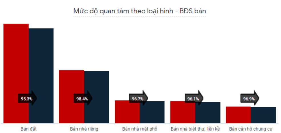 Cụ thể, chung cư ghi nhận lượng tin đăng sụt giảm mạnh nhất với 16% so với tháng 7, đất nền cũng giảm 13%. Lượt tìm kiếm đất nền giảm khoảng 5%, tìm kiếm biệt thự, chung cư cũng giảm lần lượt 4% và 3% so với tháng trước đó.