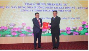 Ban Quản lý Khu kinh tế Hải Phòng mới đây đã tổ chức Hội nghị trao Giấy chứng nhận đăng ký đầu tư cho 2 dự án xây dựng nhà ở công nhân của Công ty TNHH Pegatron Việt Nam và Công ty TNHH Universal ...